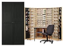 The Work Box is every crafters dream. Its a workspace and a storage solution that looks like a beautiful, high-end piece of furniture. There are drawers, nooks and spaces for all of your stuff! On wheels, The Work Box is fully transportable. It folds up into a handsome box, hiding all of your supplies from sight. This system comes with a collapsible work table and adjustable shelves. There are 85 removable canvas totes with label inserts that fold up for easy storage. There are also 20 removable clear zipper pouches in 3 sizes. gt; Choose either raised panel or beadboard door styles and black or vanilla colors to match your room decor. Included Canvas Tote Sizes: (3) 6"width x 12"length x 12"high (22) 12.25"width x 12.25"length x 3"high (10) 12.25"width x 12.25"length x 5.5"high (30) 3"width x 12"length x 3"high (20) 5.5"width x 12"length x 4.5"high Total: 85 Included Clear Zipper Pouch Sizes: (2) 13" x 13" Large (6) 13" x 6" Medium (12) 6" x 6" Small Total: 20