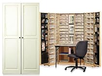 The Work Box is every crafters dream. Its a workspace and a storage solution that looks like a beautiful, high-end piece of furniture. There are drawers, nooks and spaces for all of your stuff! On wheels, The Work Box is fully transportable. It folds up into a handsome box, hiding all of your supplies from sight. This system comes with a collapsible work table and adjustable shelves. There are 85 removable canvas totes with label inserts that fold up for easy storage. There are also 20 removable clear zipper pouches in 3 sizes. Choose either raised panel or beadboard door styles and black or vanilla colors to match your room decor. Included Canvas Tote Sizes: (3) 6"width x 12"length x 12"high (22) 12.25"width x 12.25"length x 3"high (10) 12.25"width x 12.25"length x 5.5"high (30) 3"width x 12"length x 3"high (20) 5.5"width x 12"length x 4.5"high Total: 85 Included Clear Zipper Pouch Sizes: (2) 13" x 13" Large (6) 13" x 6" Medium (12) 6" x 6" Small Total: 20
